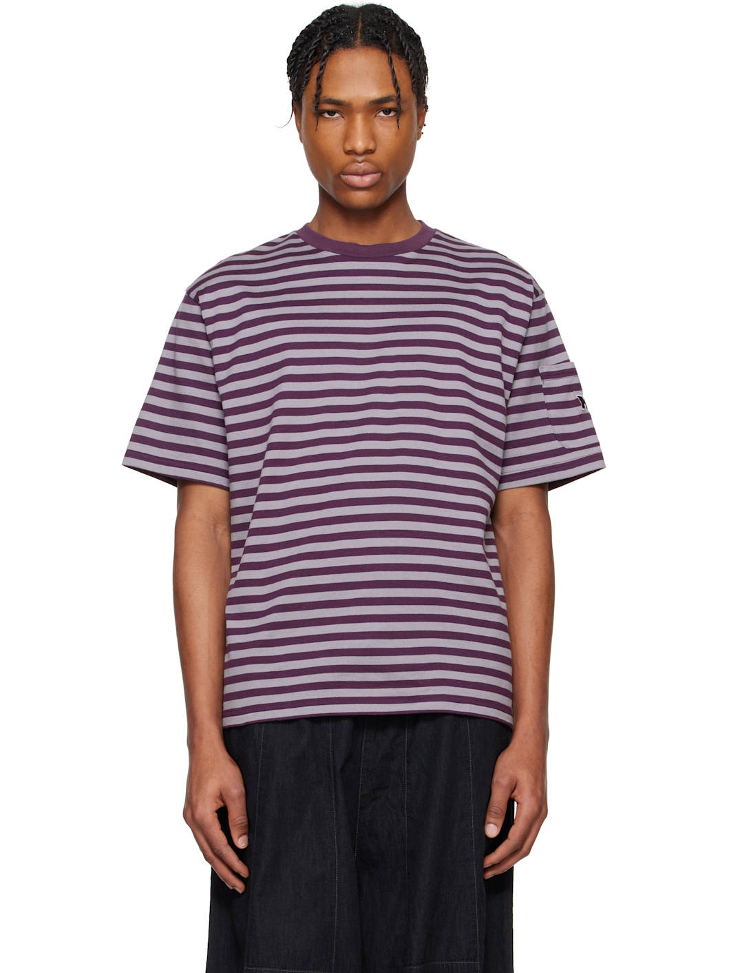Cotton jersey T-shirt. Stripe pattern throughout. · Rib-knit crewneck · Patch pocket and logo embroidered at sleeve Supplier color: Purple/Sax Body: 100% cotton. Trim 1: 100% cotton. Trim 2: 100% rayon. Made in Japan 251821M213011