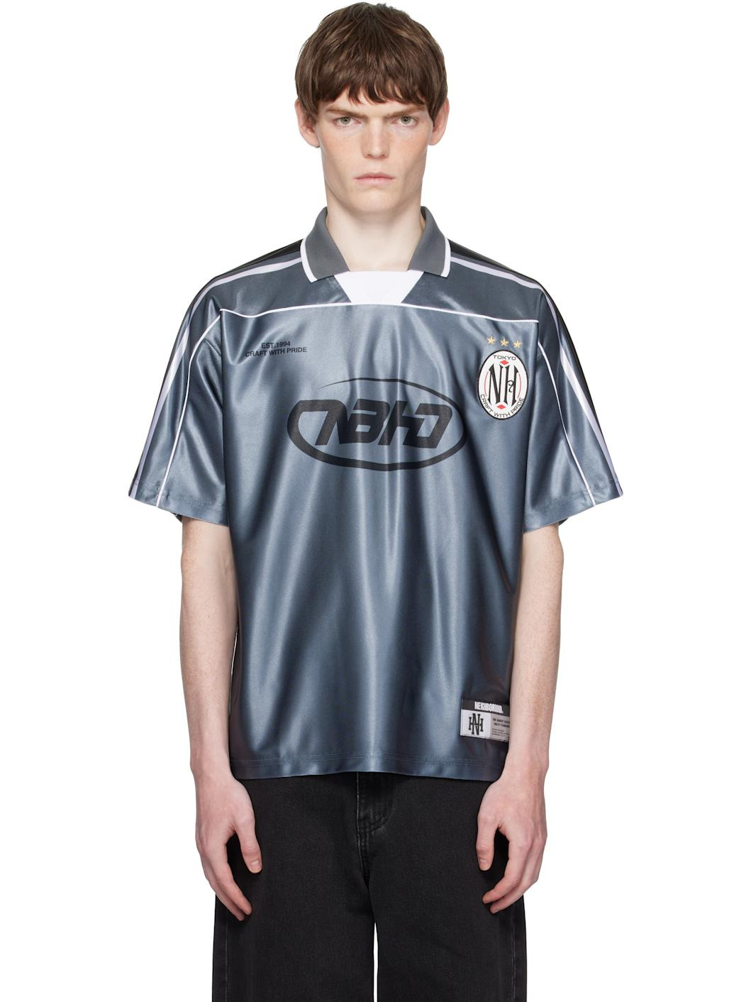 Satin jersey polo. · Striped spread collar and sleeves · Rib-knit collar and placket · Elasticized insert at open placket · Printed text, printed logo, and embroidered graphic at chest · Embroidered logo graphic patch · Logo patch at front hem · Logo flag at side seam · Yoke sleeves · Logo printed at back Supplier color: Gray 100% polyester. Made in Japan 252019M212001