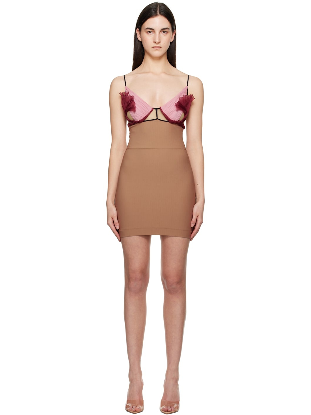 Sheer stretch nylon tulle and stretch viscose-blend jersey minidress. Silk chiffon trim throughout. · Sweetheart neck · Padding and underwire at cups · Adjustable spaghetti straps · Zip closure at back Supplier color: Macchiato Body: 83% viscose, 12% polyamide, 5% elastane. Trim 1: 100% silk. Trim 2: 49% polyamide, 35% silk, 16% elastane. Trim 3: 86% polyamide, 14% elastane. Made in Italy 251334F052003
