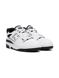 Low-top buffed leather and mesh sneakers in white and black. · Perforated detailing throughout · Lace-up closure · Padded tongue and collar · Inset logo patch at sides · Logo embossed at outer side and heel counter · Mesh lining · Logo embossed at rubber midsole · Treaded rubber sole Supplier color: White/Black Upper: leather. Sole: rubber. Made in Viet Nam 242402M237111
