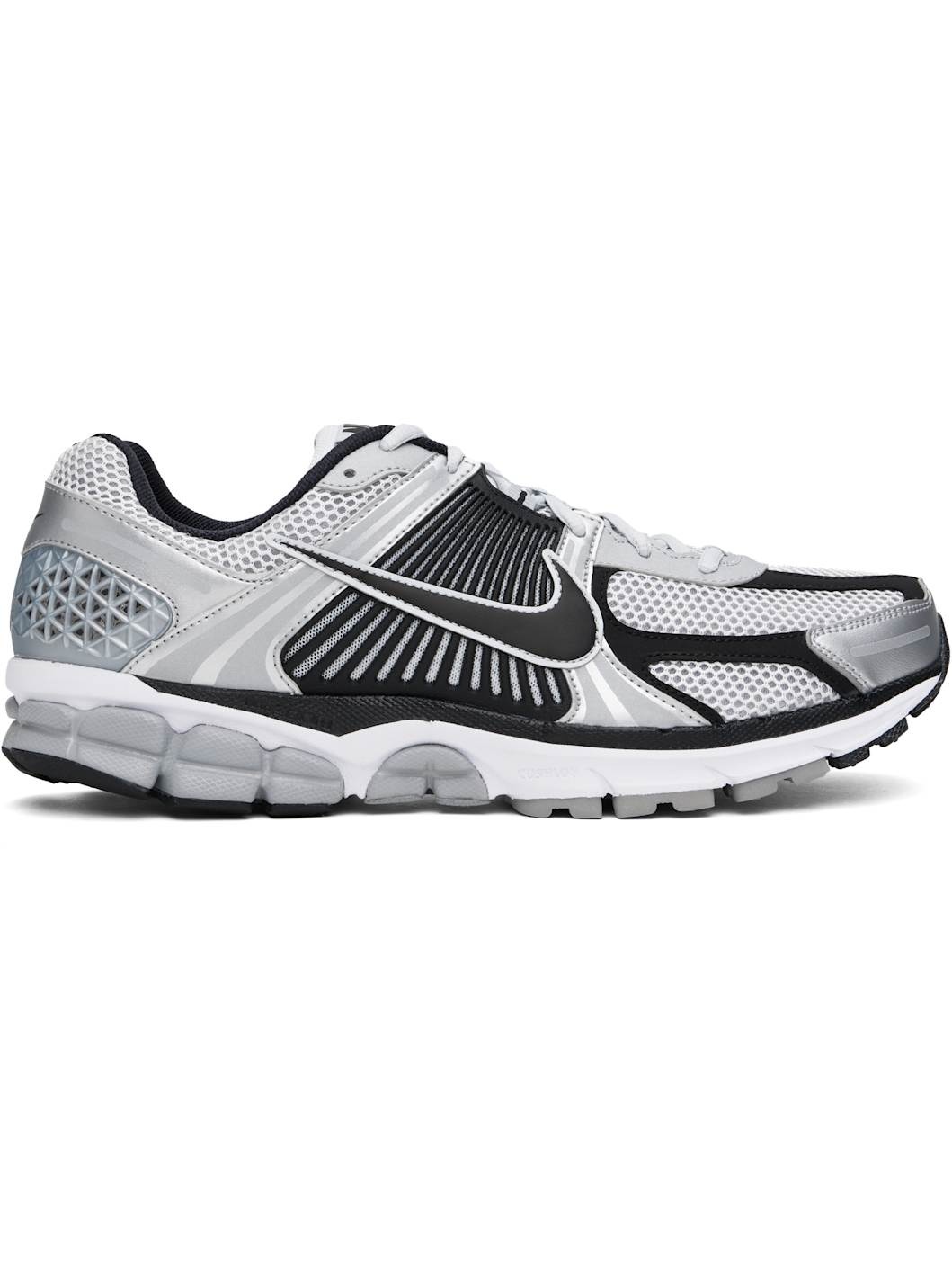 Low-top breathable mesh and buffed faux-leather sneakers in black and silver tone. · Reflective trim throughout · Lace-up closure · Logo patch at padded tongue · Padded collar · Rubberized overlay at sides and heel · Swoosh applique at sides · Swoosh printed at heel tab · Mesh lining · Zoom Air cushioning at foam rubber midsole · Treaded rubber sole Please note that this item may be shipped only within North America. Supplier color: Metallic silver/Black Upper: textile, synthetic. Sole: rubber. Made in Indonesia 251011M237067