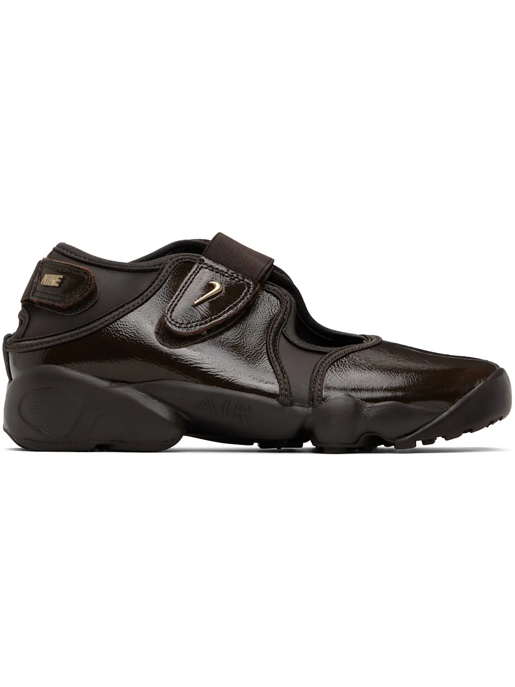Low-top crinkled patent leather and faux-leather sneakers. · Cleft toe · Elasticized velcro strap with logo hardware at vamp and heel · Cutout at heel counter · Mesh lining · Air cushioning at foam rubber midsole · Treaded rubber sole Please note that this item may be shipped only within North America. Supplier color: Velvet Brown/Velvet Brown/Metallic Gold Upper: leather, synthetic. Sole: rubber. Made in India 261011F128091