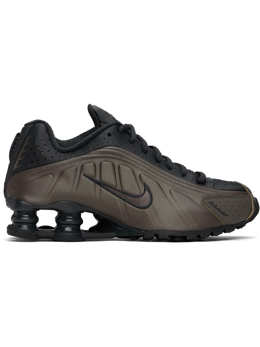 Low-top textured faux-leather and mesh sneakers in khaki and black. · Perforations and reflective trim throughout · Lace-up closure · Logo bonded at padded tongue · Gel-filled logo applique · Padded collar · Swoosh embroidered at sides · Mesh lining · Nike Shox units at midsole · Treaded rubber sole Please note that this item may be shipped only within North America. Supplier color: Off noir/Ironstone/Dark smoke grey/Off noir Upper: synthetic, textile. Sole: rubber. Made in Indonesia 251011F128155
