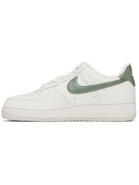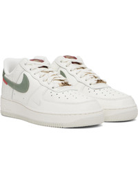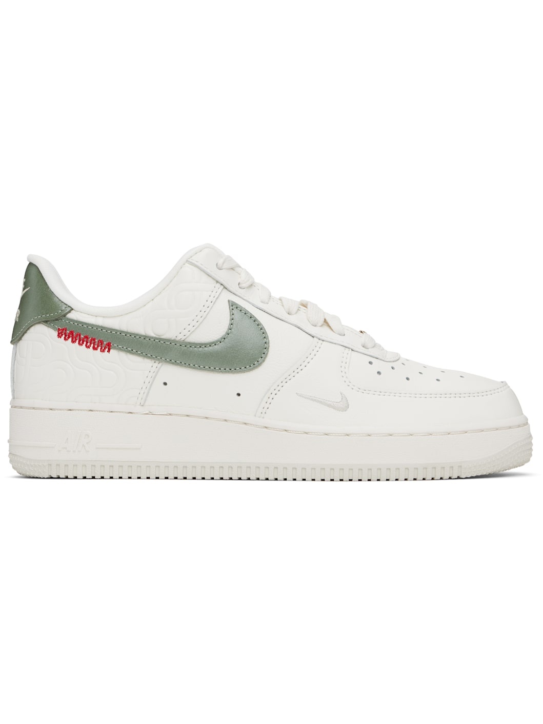 Low-top buffed leather sneakers in off-white. · Graphic pattern embossed throughout · Perforated detailing at toe and sides · Graphic hardware at lace-up closure · Logo patch at padded tongue · Padded collar · Swoosh applique at sides · Logo embroidered at heel tab · Mesh lining · Air Sole unit at midsole · Treaded rubber sole Please note that this item may be shipped only within North America. Supplier color: Sail/Light bone/University red/Jade horizon Upper: leather. Sole: rubber. Made in Viet Nam 251011M237122