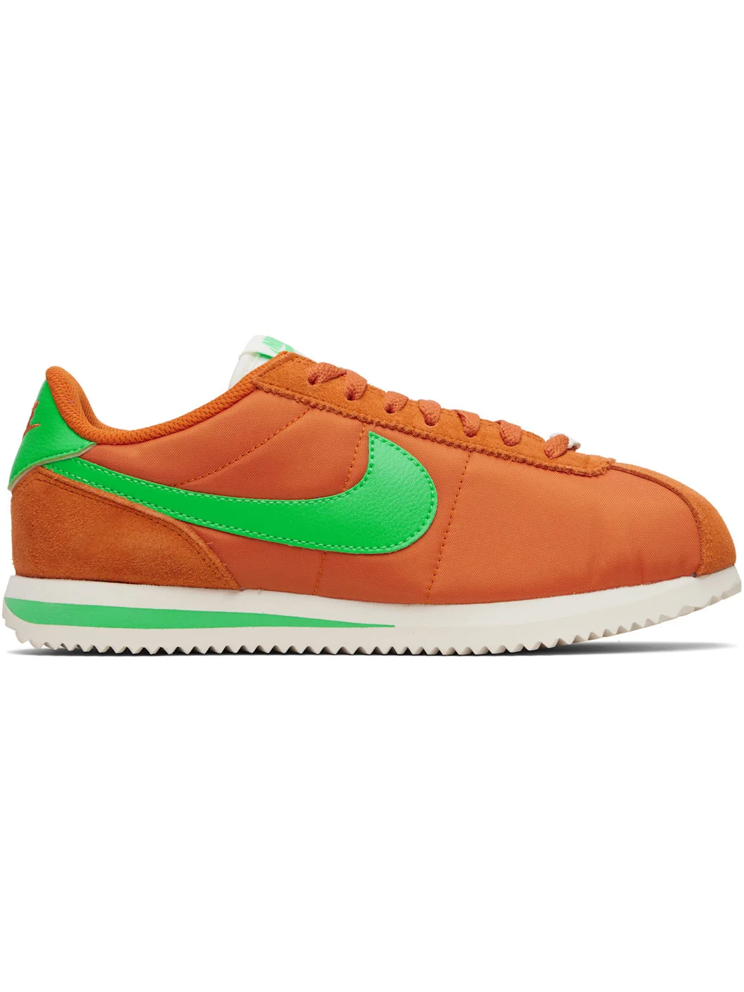 Low-top duck canvas, suede, and grained leather sneakers. · Logo plaque at lace-up closure · Logo patch at padded tongue · Padded collar · Swoosh applique at sides · Logo embroidered at heel tab · Mesh lining · Foam rubber midsole · Treaded rubber sole Please note that this item may be shipped only within North America. Supplier color: Campfire orange/Green shock Upper: textile, leather. Sole: rubber. Made in Indonesia 261011M237068