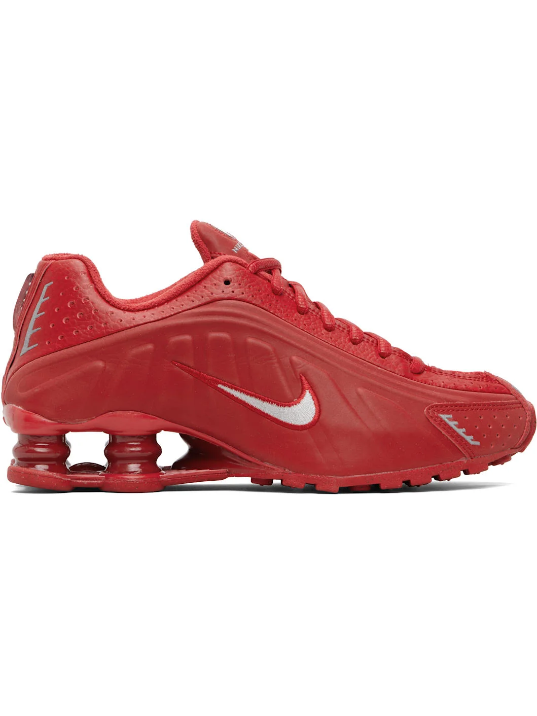 Low-top buffed faux-leather, grained faux-leather, and mesh sneakers. · Perforated detailing throughout · Lace-up closure · Logo bonded at padded tongue · Logo applique at tongue and heel tab · Padded collar · Swoosh applique at sides · Suede lining · Nike Shox units at midsole · Treaded rubber sole Please note that this item may be shipped only within North America. Supplier color: Gym Red and Metallic Silver Upper: synthetic, textile. Sole: rubber. Made in Indonesia 261011F128103