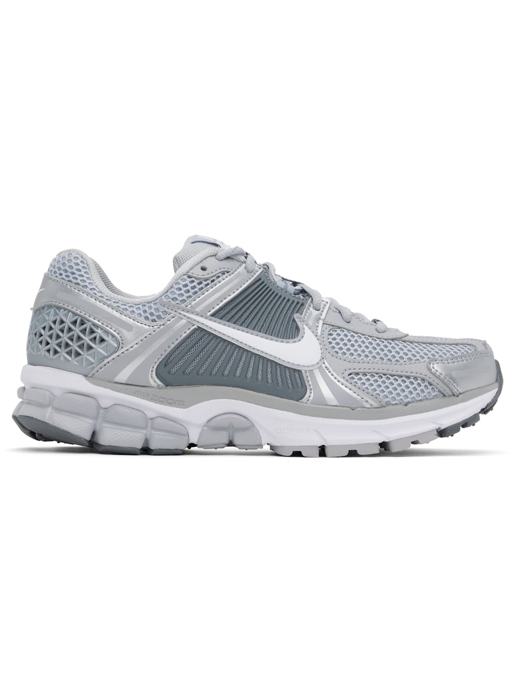 Low-top mesh and buffed faux-leather sneakers in silver tone. · Reflective trim throughout · Lace-up closure · Logo patch at padded tongue · Padded collar · Rubberized overlay at sides and heel · Swoosh applique at sides · Swoosh printed at heel tab · Mesh lining · Zoom Air cushioning at foam rubber midsole · Treaded rubber sole Please note that this item may be shipped only within North America. Supplier color: Wolf grey/White Upper: textile, synthetic. Sole: rubber. Made in Indonesia 251011M237068