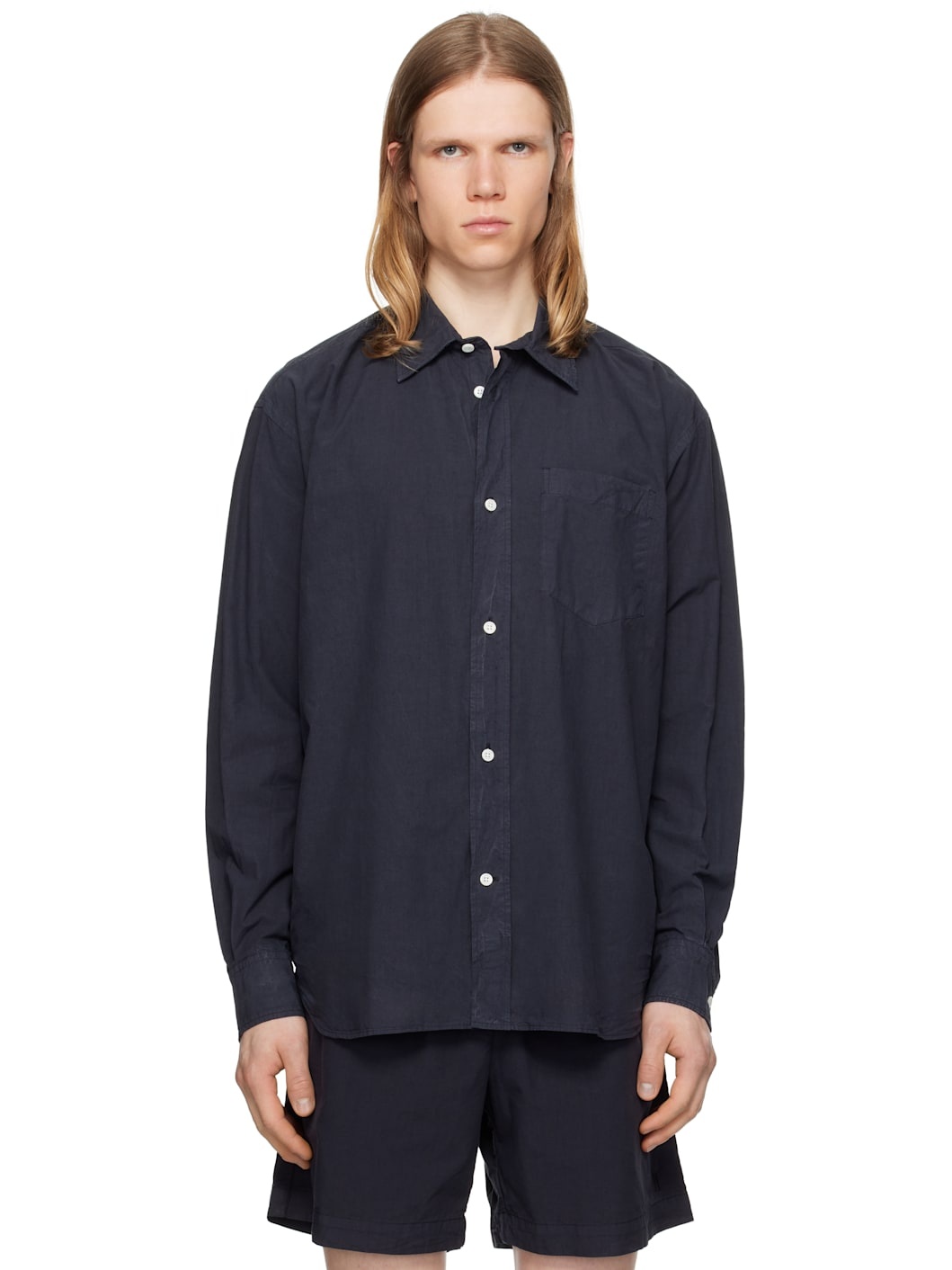 Cotton- and tencel-blend poplin shirt. · Spread collar · Button closure · Patch pocket · Shirttail hem · Adjustable buttoned barrel cuffs · Box pleat at back yoke · Mother-of-pearl hardware Supplier color: Dark navy 50% cotton, 50% tencel. Made in Portugal 252116M192003