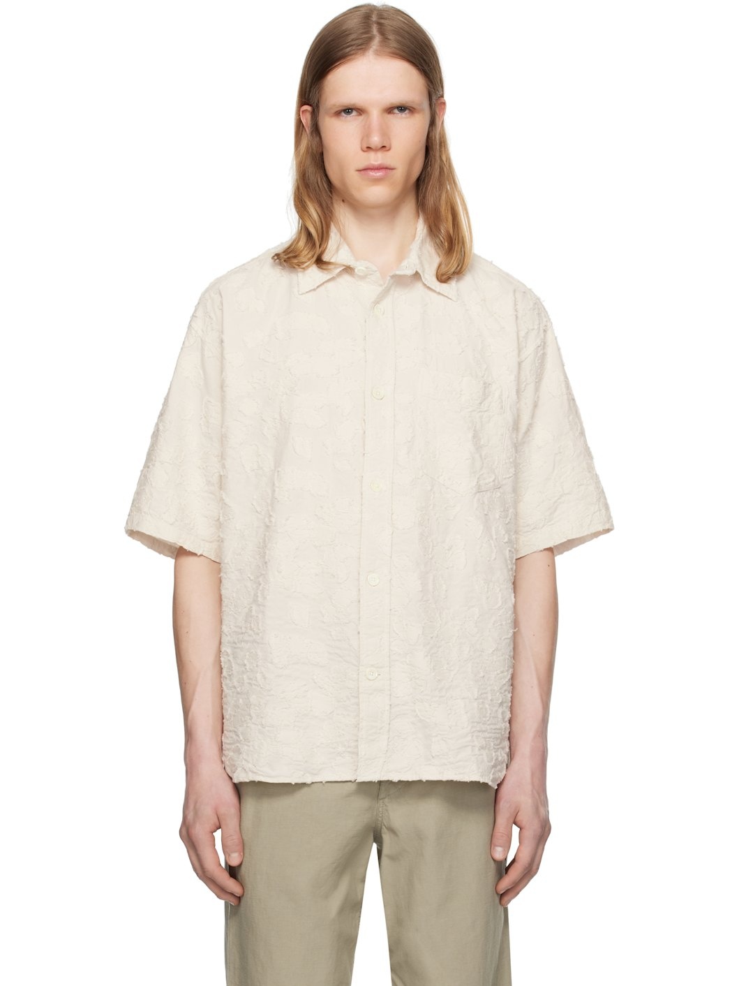 Plain-woven stretch cotton shirt. Fil coupe detailing throughout. · Spread collar · Button closure · Patch pocket · Shirttail hem · Box pleat at back yoke · Mother-of-pearl hardware Supplier color: Ecru 99% cotton, 1% elastane. Made in Portugal 251116M192010