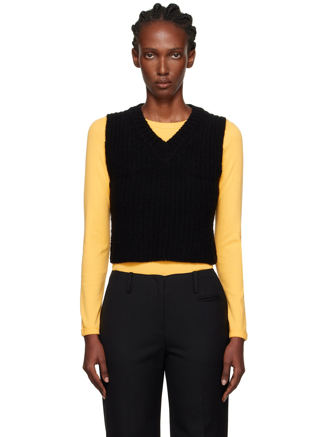 Boucle-knit wool-blend sweater vest. · V-neck · Cropped hem Supplier color: Black 85% wool, 15% nylon. Made in South Korea 252814F100000