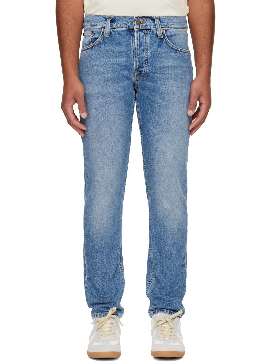 13 oz stretch organic cotton denim jeans. · Fading and whiskering throughout · Slim-fit · Mid-rise · Belt loops · Five-pocket styling · Zip fly · Logo patch at back waistband and pocket · Contrast stitching in tan Supplier color: Worn vintage 99% cotton, 1% elastane. Made in Tunisia 252078M186033