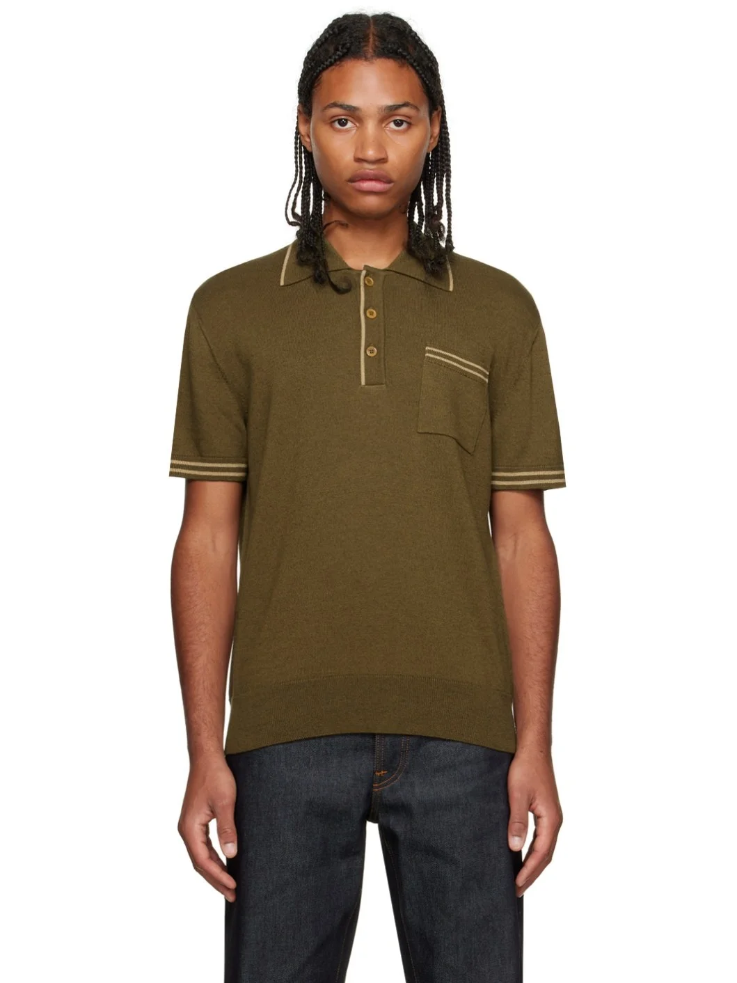 Knit wool- and cotton-blend polo. · Spread collar · Three-button placket · Rib knit trim at patch pocket · Rib knit hem and cuffs · Corozo hardware Supplier color: Olive