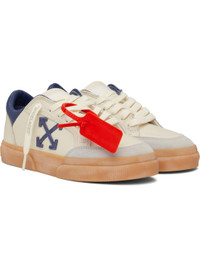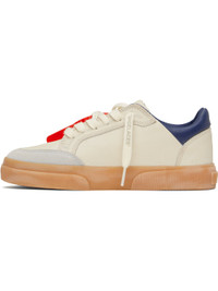 Low-top grained leather sneakers in off-white and blue. · Suede trim at toe · Signature zip-tie at lace-up closure · Logo patch at padded tongue · Padded collar · Suede arrow applique at outer side · Grained leather lining · Rubberized logo patch at midsole · Treaded vulcanized rubber sole Supplier color: Light blue/Blue Upper: leather. Sole: rubber. Made in Indonesia 251607F128000
