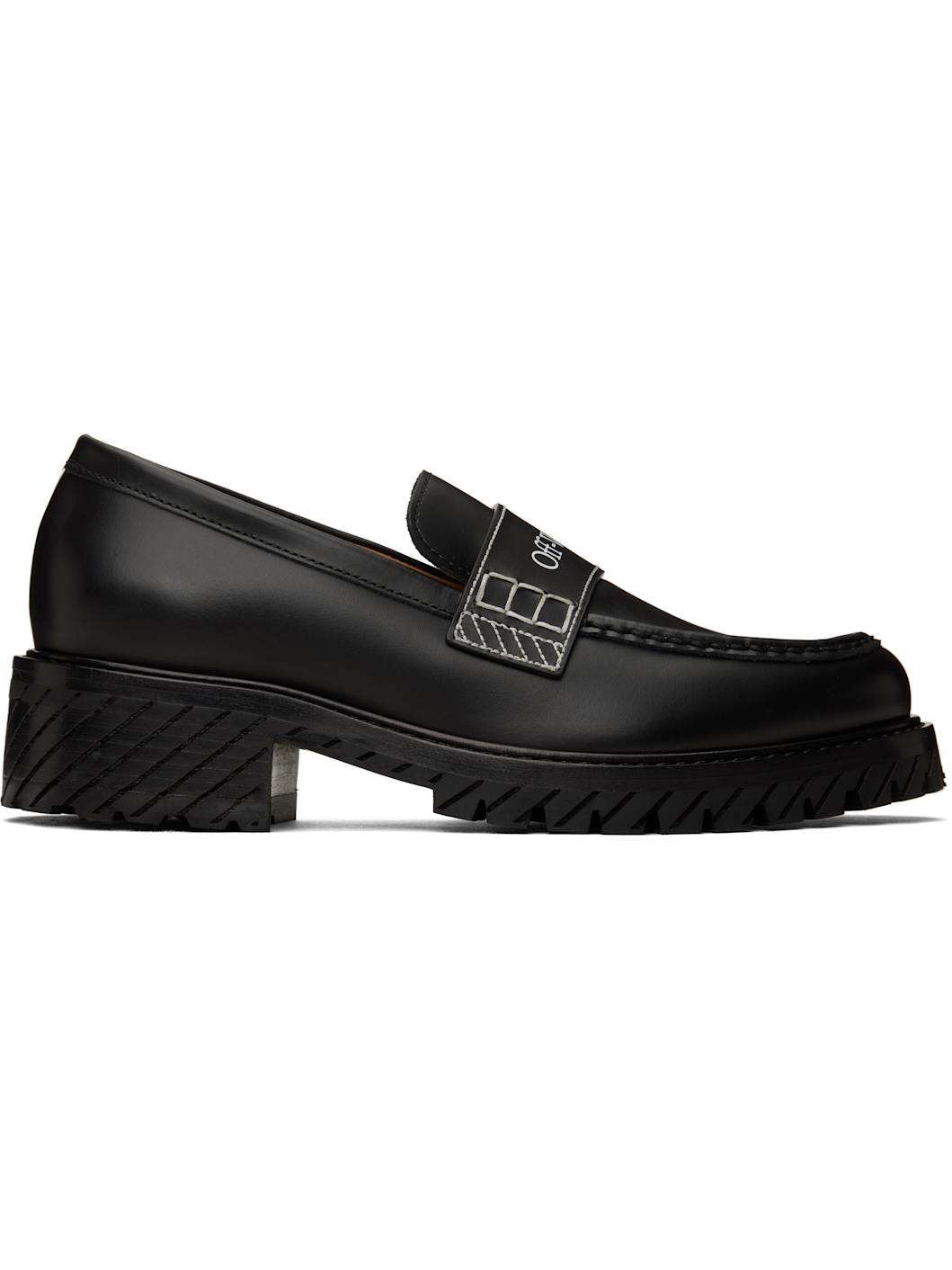 Buffed leather loafers in black. · Moc toe · Logo-printed strap at vamp · Logo stamp at padded footbed · Suede and buffed leather lining · Topstitching at welt · Stripes embossed at stacked leather midsole · Stacked leather heel with rubber injection · Treaded rubber sole · Contrast stitching in white · Heel: H1.5" Supplier color: Black/White Upper: leather. Sole: rubber. Made in Italy 242607F121021