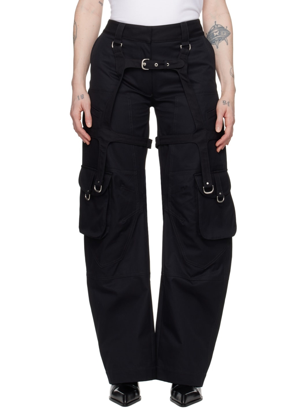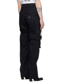 Cotton twill trousers. D-ring hardware throughout. · Paneled and layered construction · Belt loops · Four-pocket styling · Zip-fly · Pin-buckle strap at integrated harness-style overlay · Flap pocket and darts at knees · Welt pocket at outseams Supplier color: Black 100% cotton. Made in Italy 241607F087000