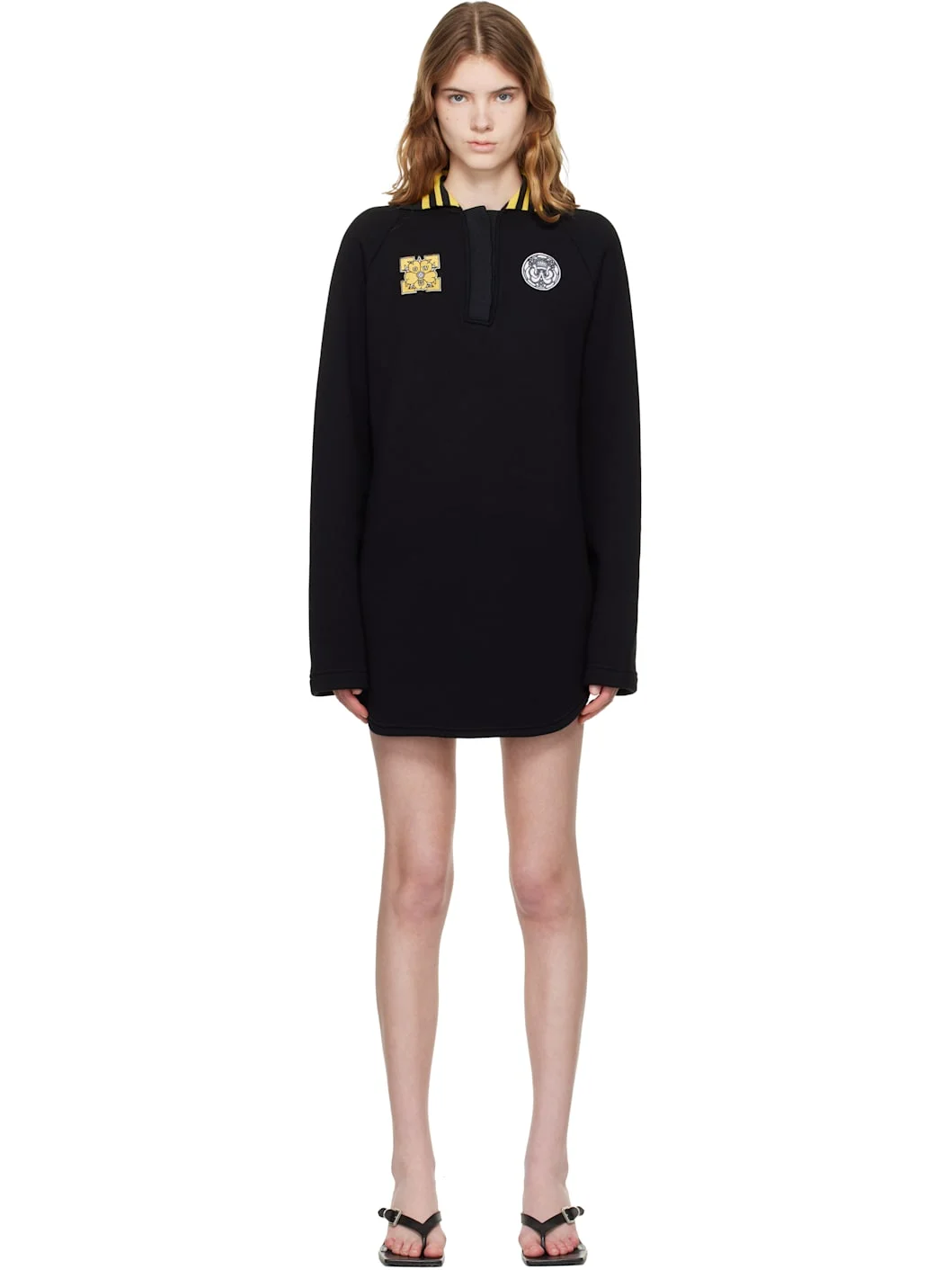 French terry minidress. · Stripes at rib-knit spread collar · Concealed four-button placket · Embroidered graphic appliques at chest · Curved hem · Raglan sleeves · Logo applique at back Supplier color: Black/White Body: 100% cotton. Trim: 100% polyester. Made in Portugal 261607F052004