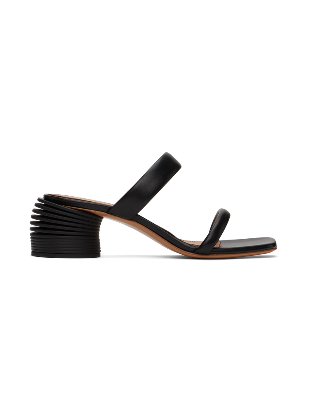 Buffed leather heeled sandals in black. · Open square toe · Straps at vamp · Logo embossed at padded leather footbed · Sculptural rubber block heel · Leather sole · Heel: H2" Supplier color: Black Upper: leather. Sole: leather, rubber. Made in Italy 241607F125001
