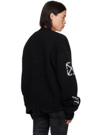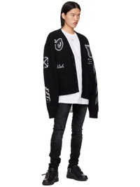 Knit wool- and cotton-blend cardigan. Jacquard logo graphics and text embroidered throughout. · Rib knit Y-neck, hem, and cuffs · Button closure · Patch pockets · Dropped shoulders Supplier color: Black/Black