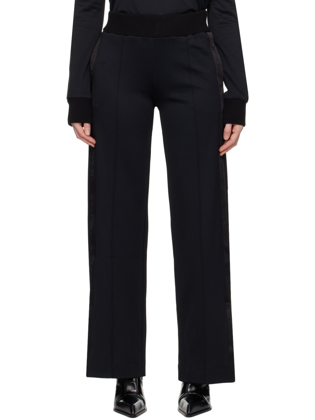 Stretch nylon twill lounge pants. · Elasticized rib knit waistband · Three-pocket styling · Central seams at legs · Vent at cuffs · Logo-woven webbing trim at outseams Supplier color: Black Body 1: 95% polyamide, 5% elastane. Body 2: 100% polyamide. Trim: 96% cotton, 4% elastane. Lining: 100% polyamide. Made in Italy 241607F086000