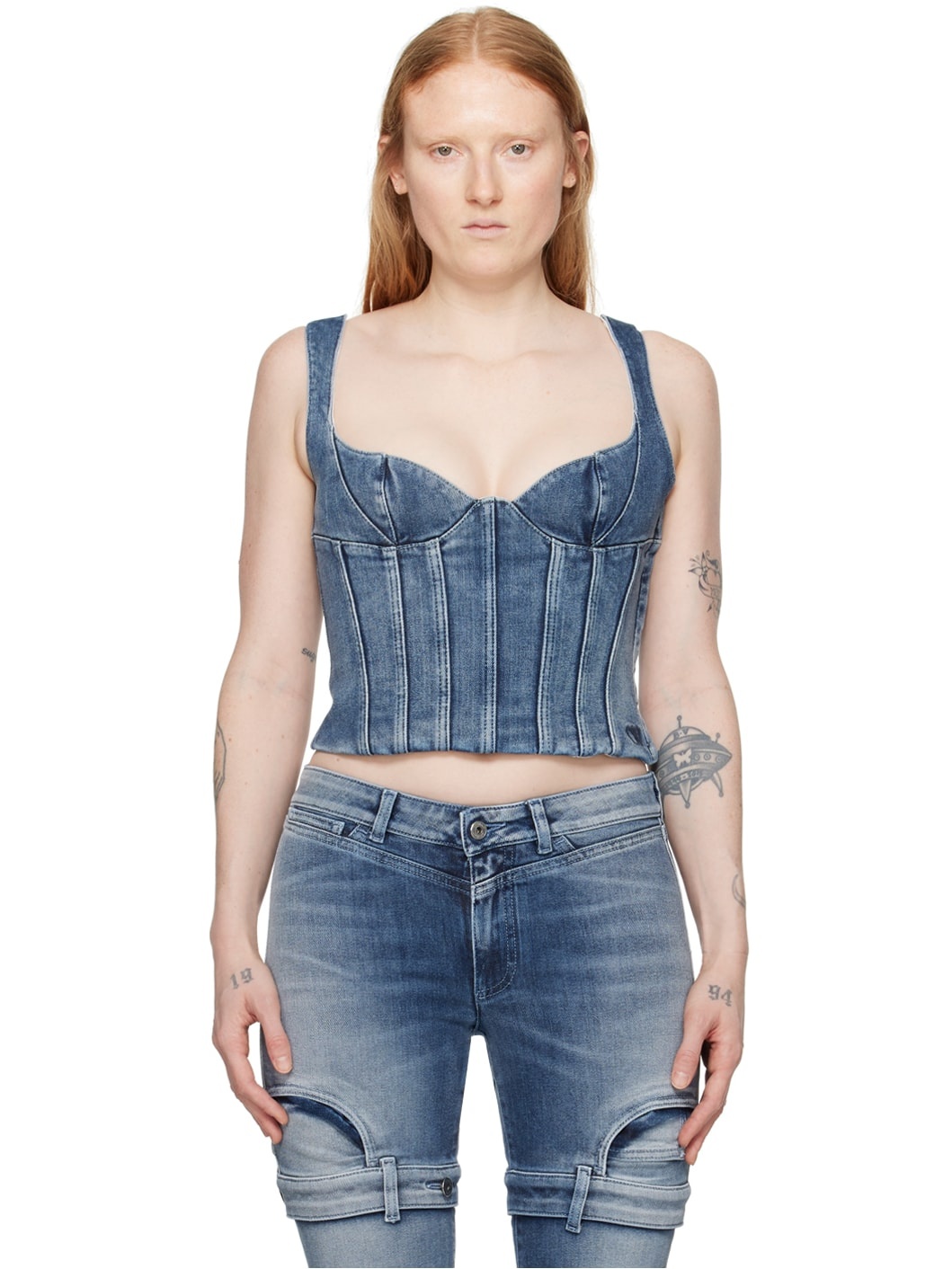 Stretch denim tank top. Fading throughout. · Sweetheart neck · Darts at cups · Boning at front and back · Cropped hem · Zip closure at side seam · Fixed shoulder straps · Full twill lining · Logo-engraved silver-tone hardware Supplier color: Blue Body: 93% cotton, 5% elastomultiester, 2% elastane. Lining: 100% cotton. Made in Italy 241607F111000