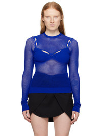 Stretch viscose-blend fishnet T-shirt. Rib knit trim throughout. · Crewneck · Cutouts at chest and shoulders · Bra-style overlay at chest · Jacquard logo at back collar Supplier color: Nautical blue 67% viscose, 28% polyester, 4% polyamide, 1% polyurethane. Made in Italy 241607F110001