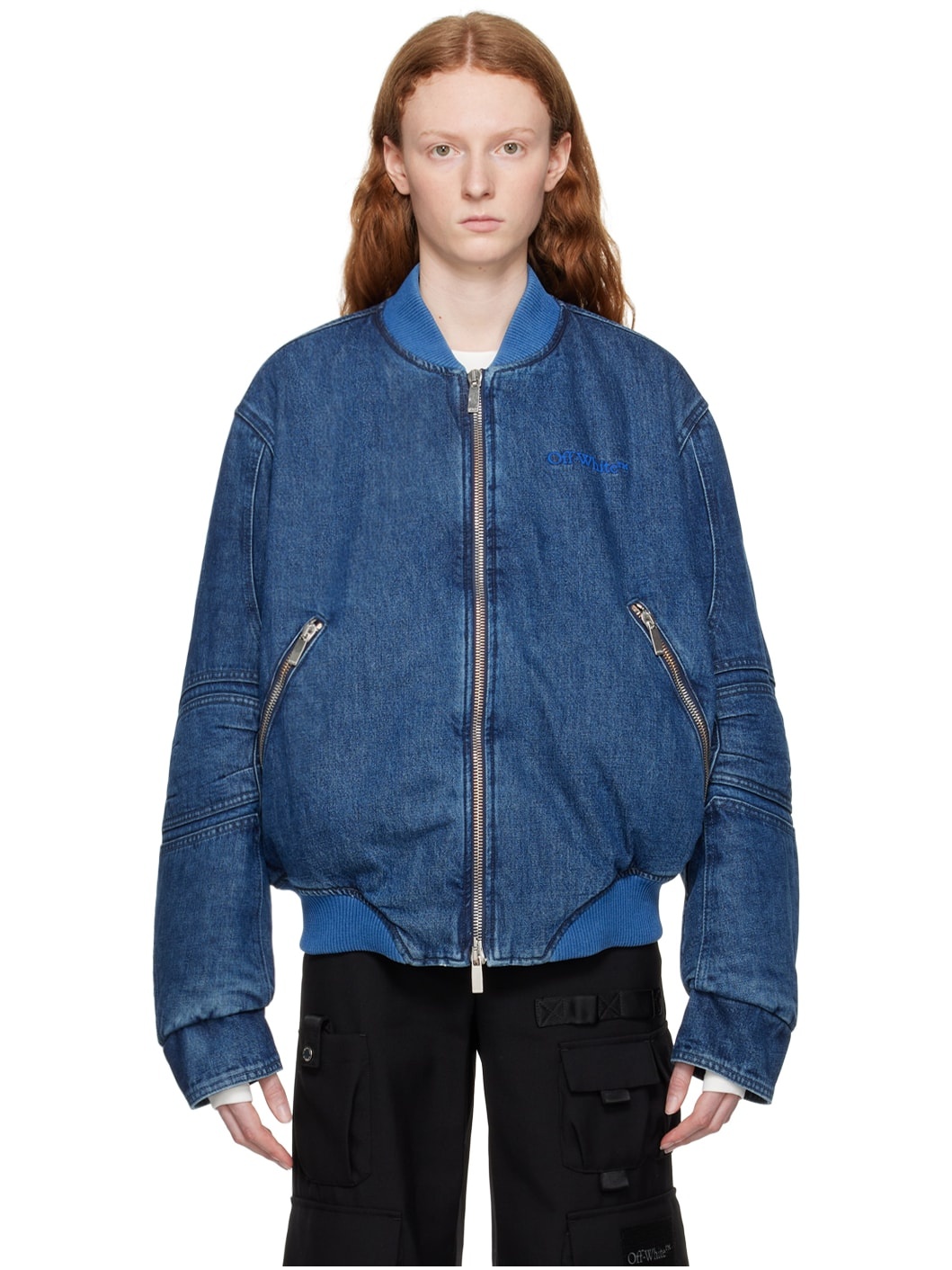 Denim bomber jacket. Fading and distressing throughout. · Rib knit stand collar and hem · Two-way zip closure · Zip pockets · Dropped shoulders · Panels and eyelets at sleeves · Fully lined · Antiqued silver-tone hardware Supplier color: Blue blue Body: 100% cotton. Lining: 65% polyester, 35% cotton. Trim 1: 100% polyester. Trim 2: 83% polyamide, 17% elastane. Made in Italy 231607F060006