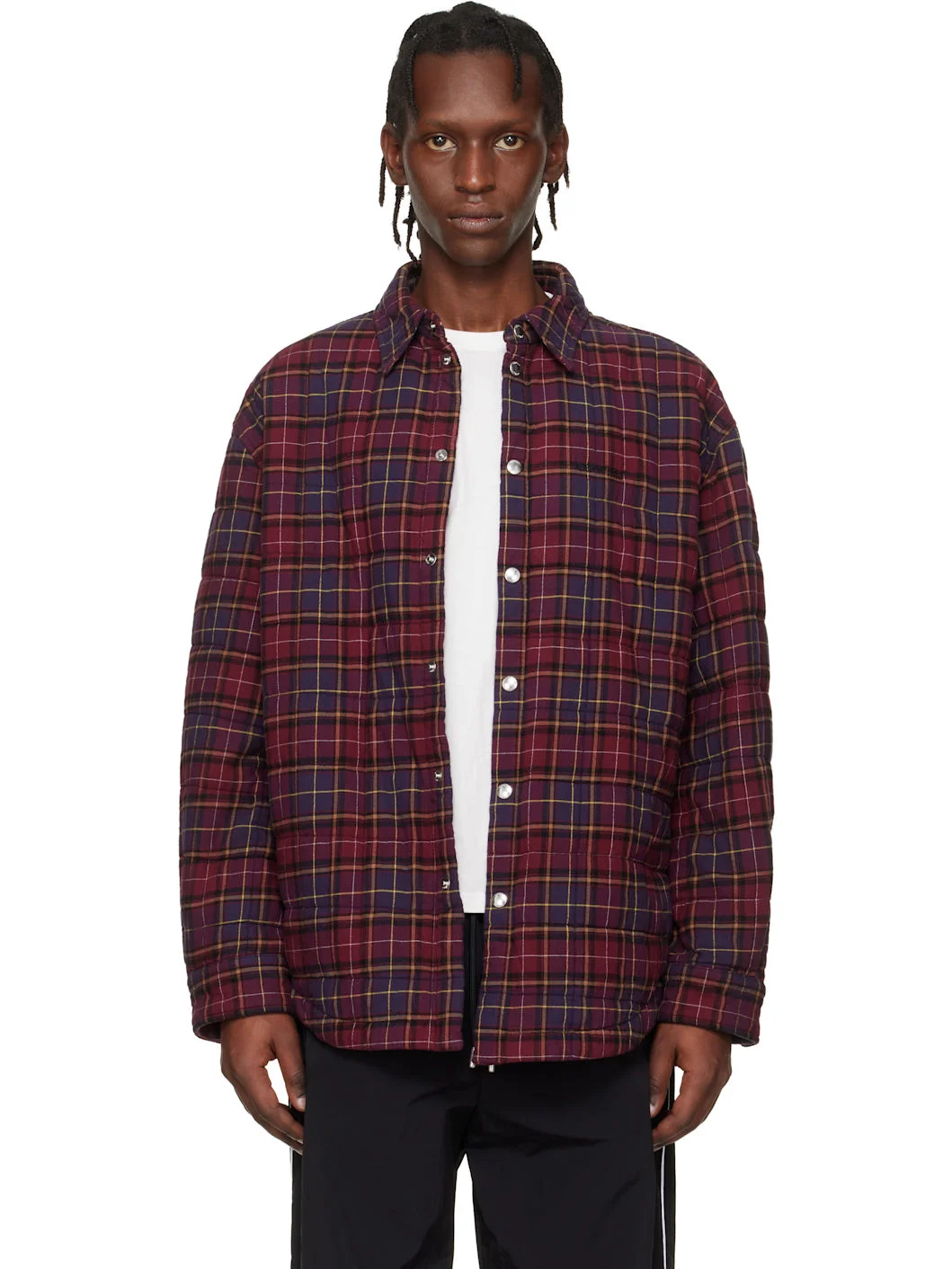 Insulated and quilted cotton flannel overshirt. · Check pattern throughout · Spread collar · Press-stud closure · Logo embroidered at chest · Shirttail hem · Press-stud barrel cuffs · Logo printed at back · Welt pocket at interior · Full mesh lining Supplier color: Burgundy Body: 100% cotton. Trim: 100% cotton. Lining: 100% polyester. Made in Italy 252607M192000