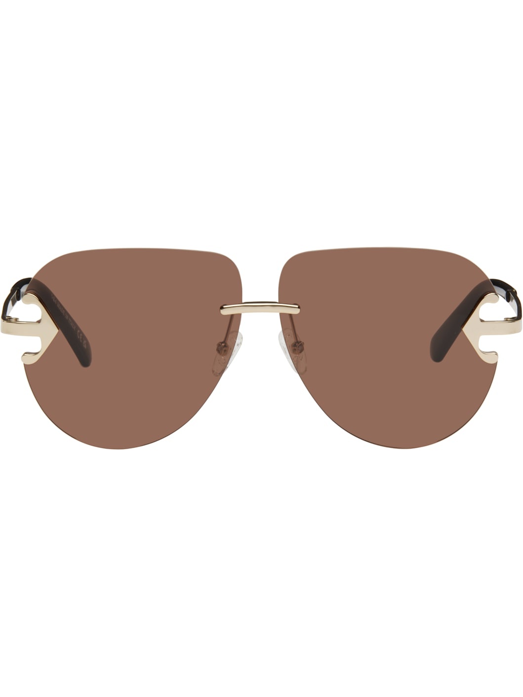 Aviator-style rimless metal-frame sunglasses in gold tone. · Brown lenses · 100% UV protection, category 3 · Arrow hardware at face · Adjustable rubber nose pads · Logo etched at temples · Acetate temple tips · Includes pouch · Size: 62.11 150 Supplier color: Gold/Brown Metal, acetate. Made in Italy 251607M134082