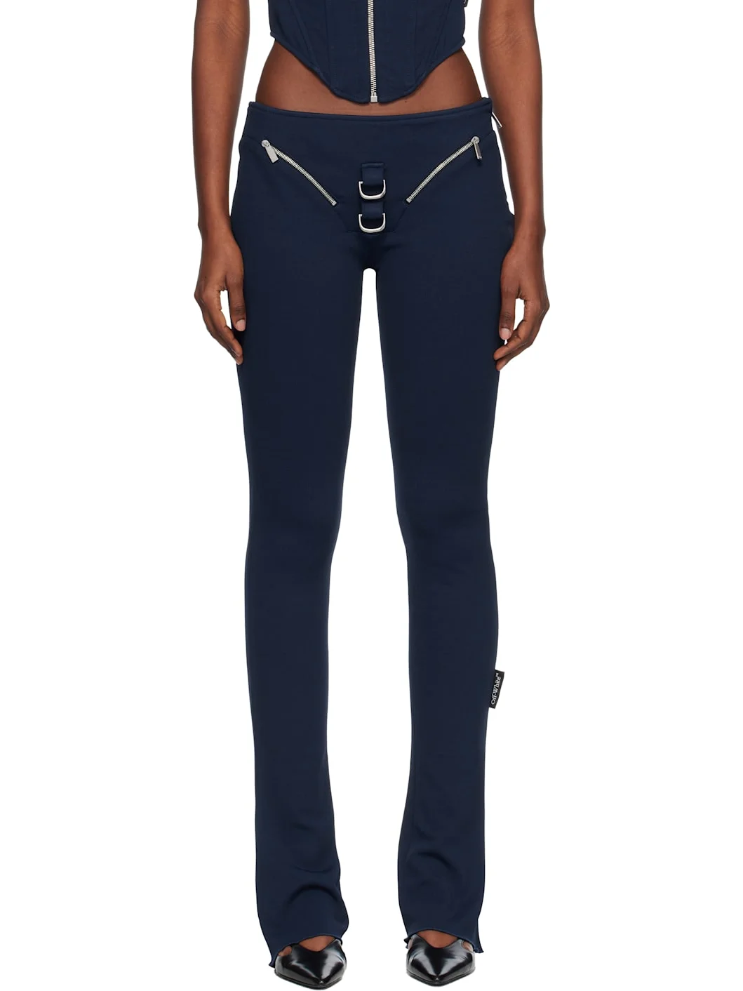 Heavyweight jersey trousers. · Low-rise · Flared-leg · Belt loop and mock zip pockets at waist · Concealed zip closure with logo flag at side-seam Supplier color: Blue Iris/No Color 61% viscose, 31% polyamide, 8% elastane. Made in Italy 252607F087000