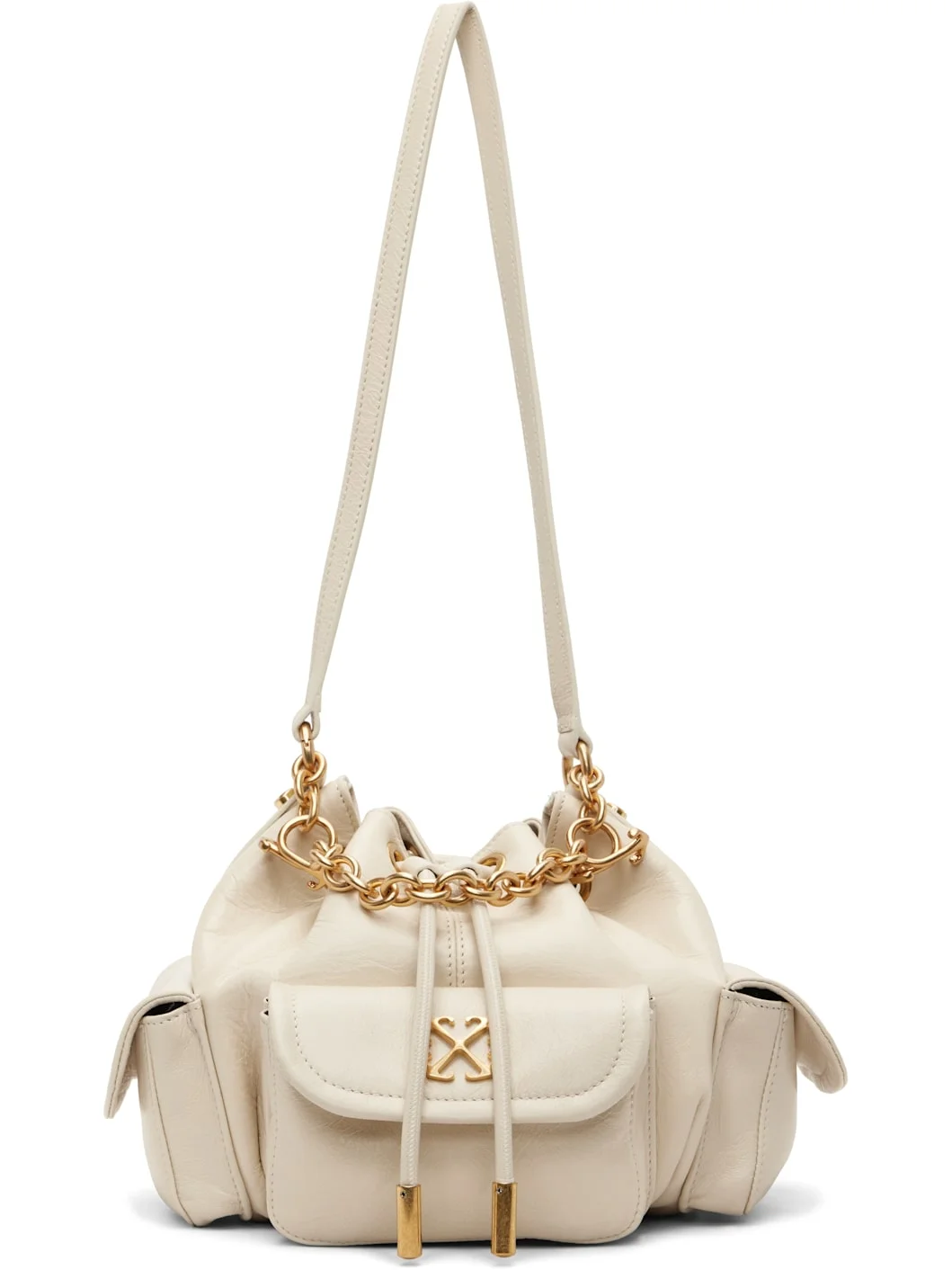 Grained calfskin shoulder bag. · Logo hardware at cable chain carry handle · Fixed shoulder strap · Magnetic flap pocket with logo hardware at face, back face, and sides · Drawstring closure · Card slot at interior · Twill lining · H7" x W11" x D7" Supplier color: Dust/No color Calfskin. Made in Italy 252607F048014