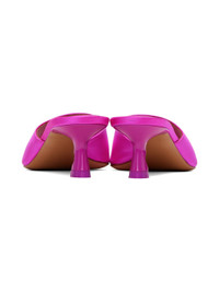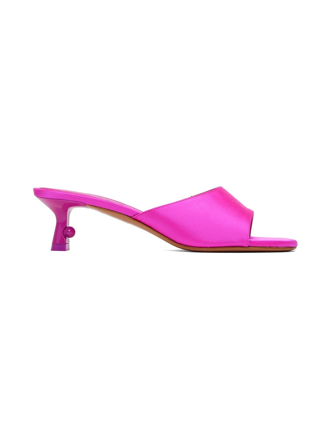 Satin heeled sandals in pink. · Open square toe · Strap at vamp · Logo printed at padded leather footbed · Kitten heel with rubber injection · Leather sole · Heel: H1.5 in Supplier color: Fuchsia/Fuchsia Upper: textile, leather. Sole: leather, rubber. Made in Italy 231607F122004