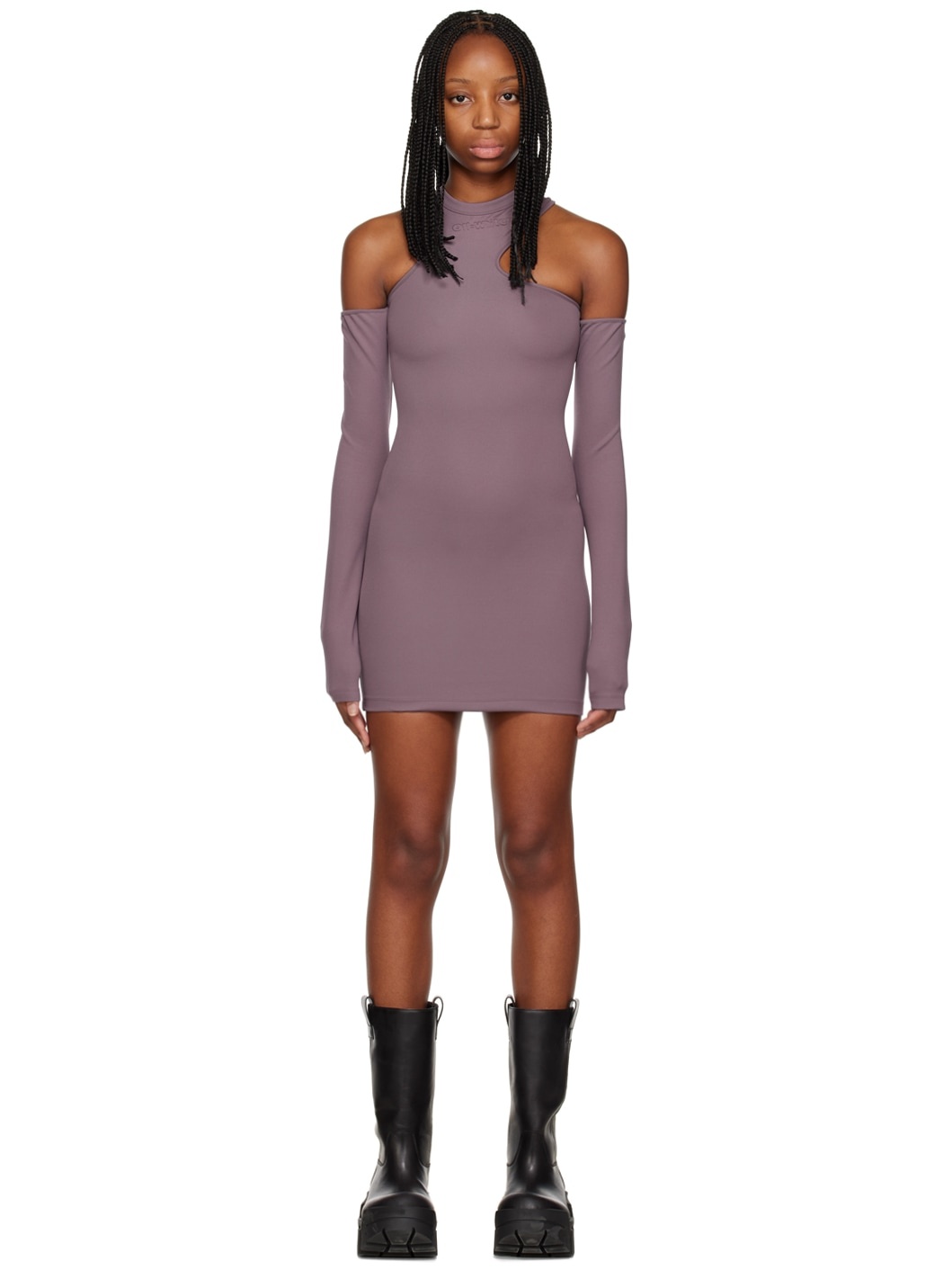 Stretch nylon jersey minidress. · Asymmetric construction · Rib knit crewneck · Logo embossed at chest · Cut-out at shoulders Supplier color: Violet 86% polyamide, 14% elastane. Made in Italy 222607F052021