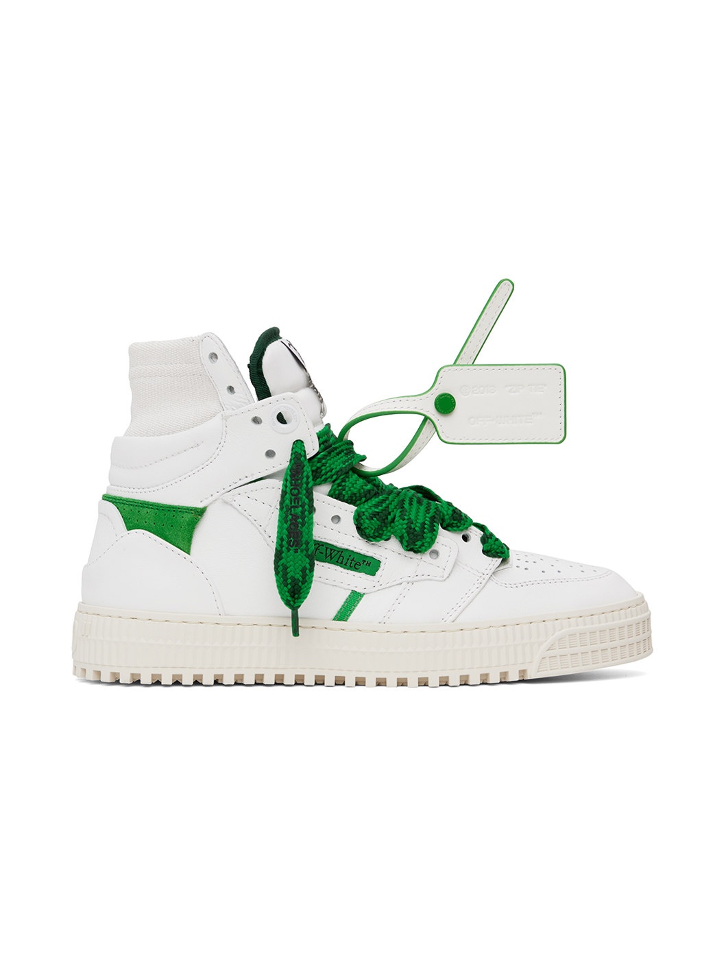 High-top paneled grained calfskin and canvas sneakers in white and green. · Perforated detailing at toe · Signature zip-tie at lace-up closure · Logo patch at padded tongue · Logo embossed at inner side · Logo patch at outer side · Suede trim at heel counter · Text embossed at heel · Grained leather and jersey lining · Treaded rubber sole Supplier color: White/Green Upper: calfskin, textile. Sole: rubber. Made in Italy 241607M236001