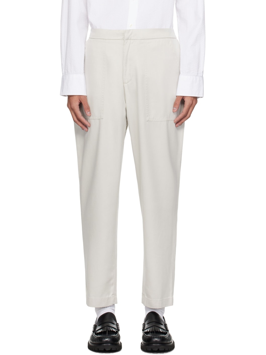 Garment-dyed loose-fit lyocell twill trousers. · Concealed drawstring at partially elasticized waistband · Four-pocket styling · Zip-fly Supplier color: Stone Body: 100% lyocell. Lining: 100% cotton. Made in Portugal 241305M191001