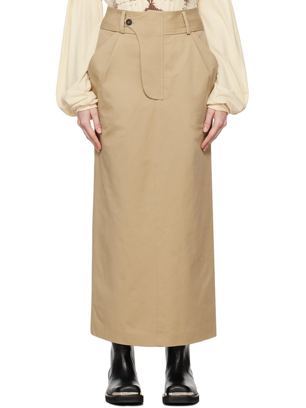 Cotton twill skirt. · Belt loops · Three-pocket styling · Zip-fly · Pleats at front · Darts at back waistband · Full twill lining Supplier color: Beige Body: 100% cotton. Lining 1: 100% polyester. Lining 2: 80% polyester, 20% cotton. Made in South Korea 242731F093003