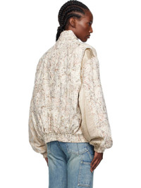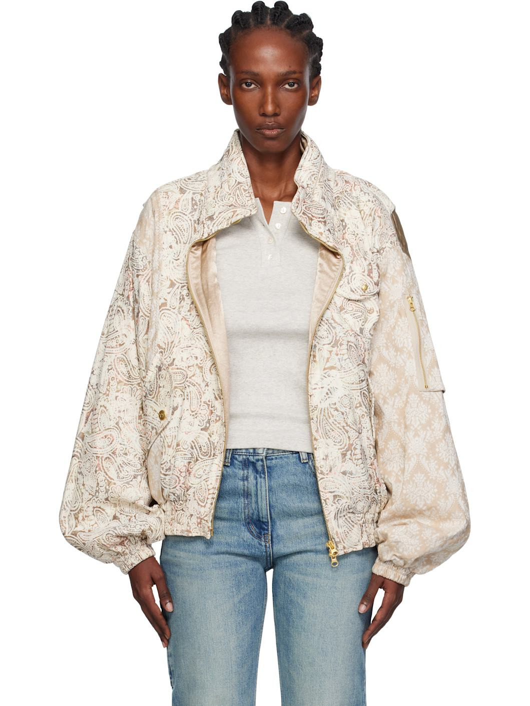 Padded stretch gobelin bomber jacket. · Stand collar · Two-way zip closure · Patch pocket with press-stud flap at chest · Welt pockets and flap pockets at waist · Elasticized hem and cuffs · Utility pocket and embroidered logo at sleeve · Gusset and satin panel at back shoulders · Welt pocket at interior · Full satin lining · Logo-engraved gold-tone hardware Supplier color: Beige Body 1: 97% polyester, 3% polyurethane. Body 2: 60% rayon, 37% cotton, 3% polyurethane. Body 3: 100% acetate. Fill: 100% polyester. Lining: 100% polyester. Made in South Korea 252731F058001