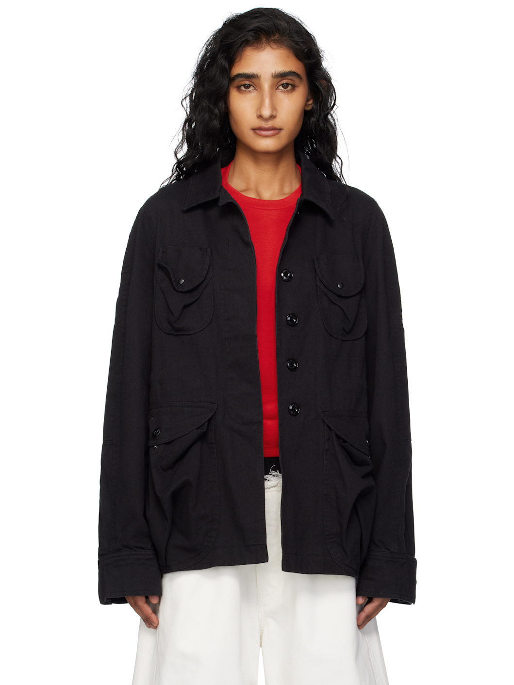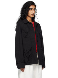 Non-stretch denim jacket. · Spread collar · Concealed button closure · Bellows pockets at front · Grommets at armscyes · Press-stud barrel cuffs · Raglan sleeves at back · Central vent at back hem · Drawstring at interior waist · Full cotton seersucker lining Supplier color: Black 100% cotton. Made in South Korea 252731F063000