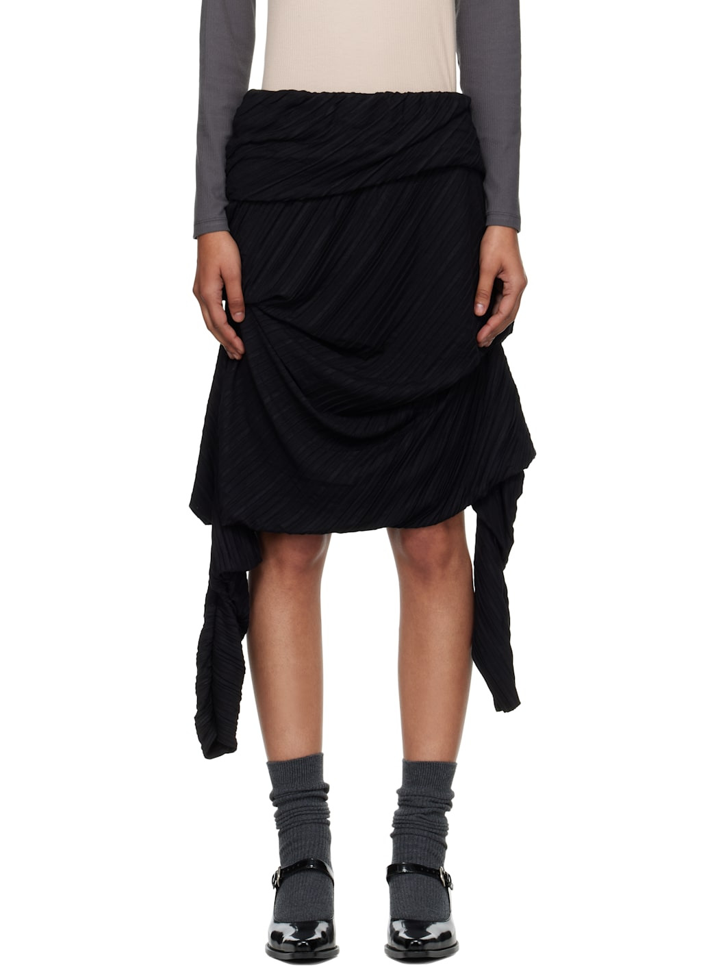 Garment-pleated stretch jersey midi skirt. · Draped and tiered construction · Elasticized waistband · Extended trim at hem Supplier color: Black 52% polyester, 34% rayon, 4% polyurethane. Made in South Korea 252731F092001