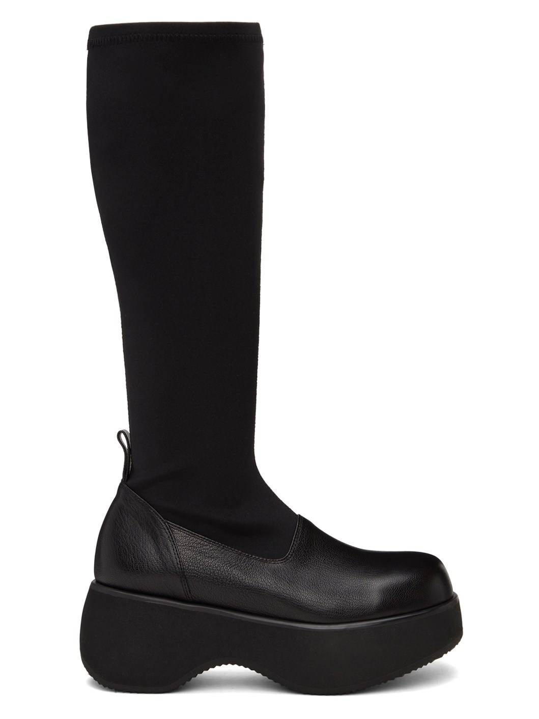 Knee-high paneled grained leather and bonded jersey boots in black. · Zip closure at inner side · Pull-loop at heel counter · Grained leather and suede lining · Foam rubber platform midsole · Treaded rubber outsole · Platform: H2.5 in Supplier color: Black