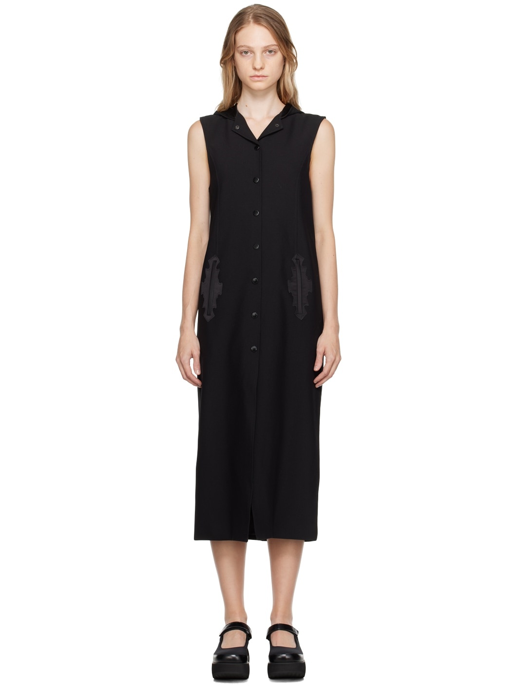 Stretch polyester- and rayon-blend twill dress. · Zip vent at hood · Round neck · Press-stud closure · Graphic applique at welt pockets · Mock pockets and cutout at back · Full satin lining Supplier color: Black Body: 75% polyester, 18% rayon, 7% polyurethane. Trim: 69% polyester, 28% rayon, 3% polyurethane. Lining: 100% polyester. Made in South Korea 232731F054002