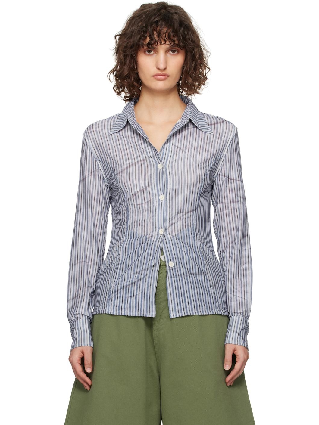 Double-faced nylon-blend mesh shirt. Stripes and trompe l'ail graphic printed throughout. - Semi-sheer - Spread collar - Button closure - Darts at front and back - Seam pockets - Shirttail hem - Pleats at single-button barrel cuffs Supplier color: Blue
