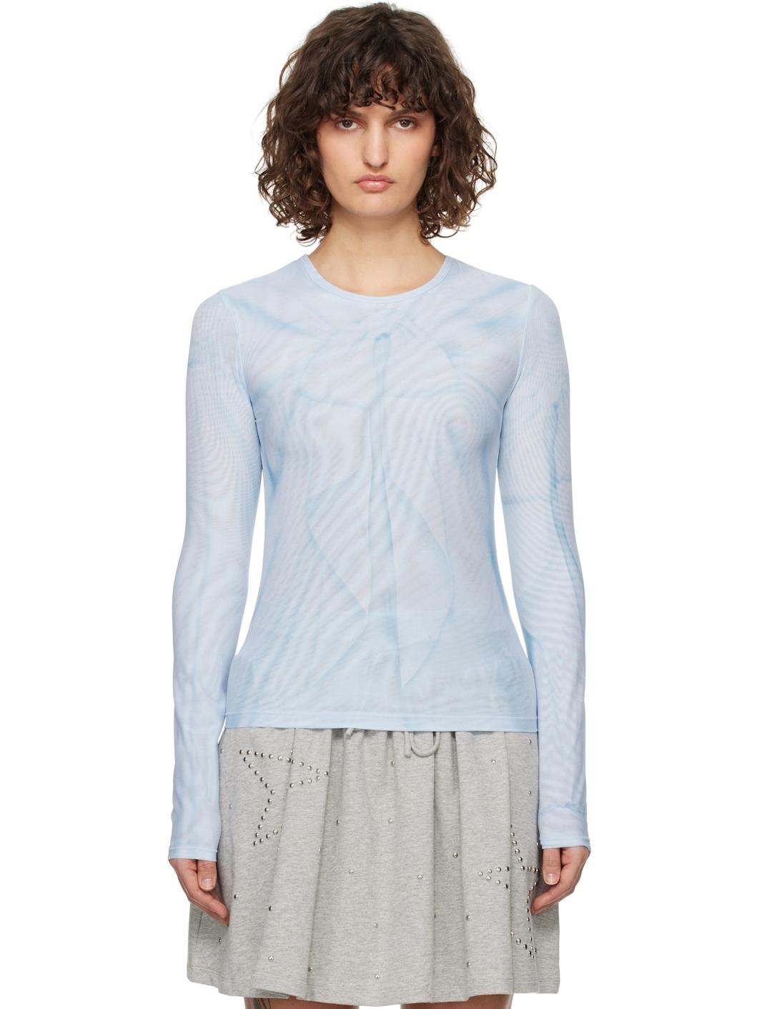 Blue Ribbon Print Mesh Long Sleeve T-shirt