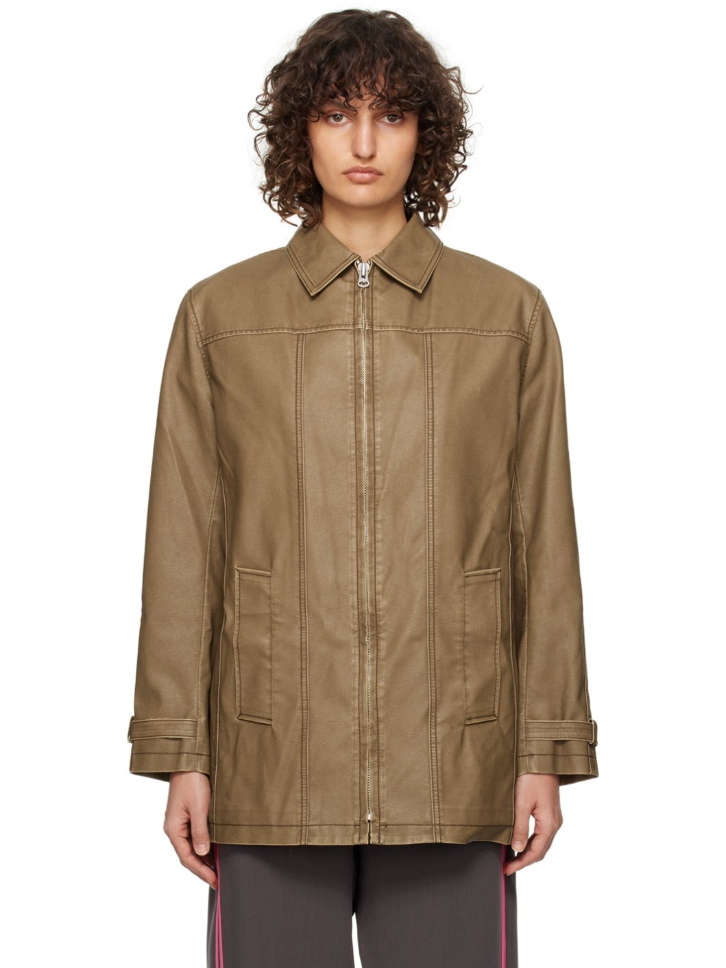 Grained faux-leather jacket. · Paneled construction · Spread collar · Zip closure · Welt pockets · Dropped shoulders · Adjustable pin-buckle tab at cuffs · Graphic printed at back · Full twill and satin lining Supplier color: Brown Body: 65% polyurethane, 35% rayon. Lining 1: 48% acrylic, 48% polyester, 4% polyurethane. Lining 2: 100% polyester. Made in South Korea 231731F063007
