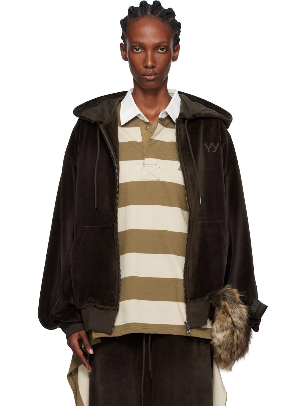 Cotton-blend velour hoodie. · Drawstring at hood · Two-way zip closure · Logo embroidered at chest · Rib-knit hem and cuffs · Dropped shoulders · Jersey lining at hood Supplier color: Brown Body 1: 76% cotton, 24% polyester. Body 2: 95% cotton, 5% polyurethane. Trim: 100% cotton. Made in South Korea 252731F097006