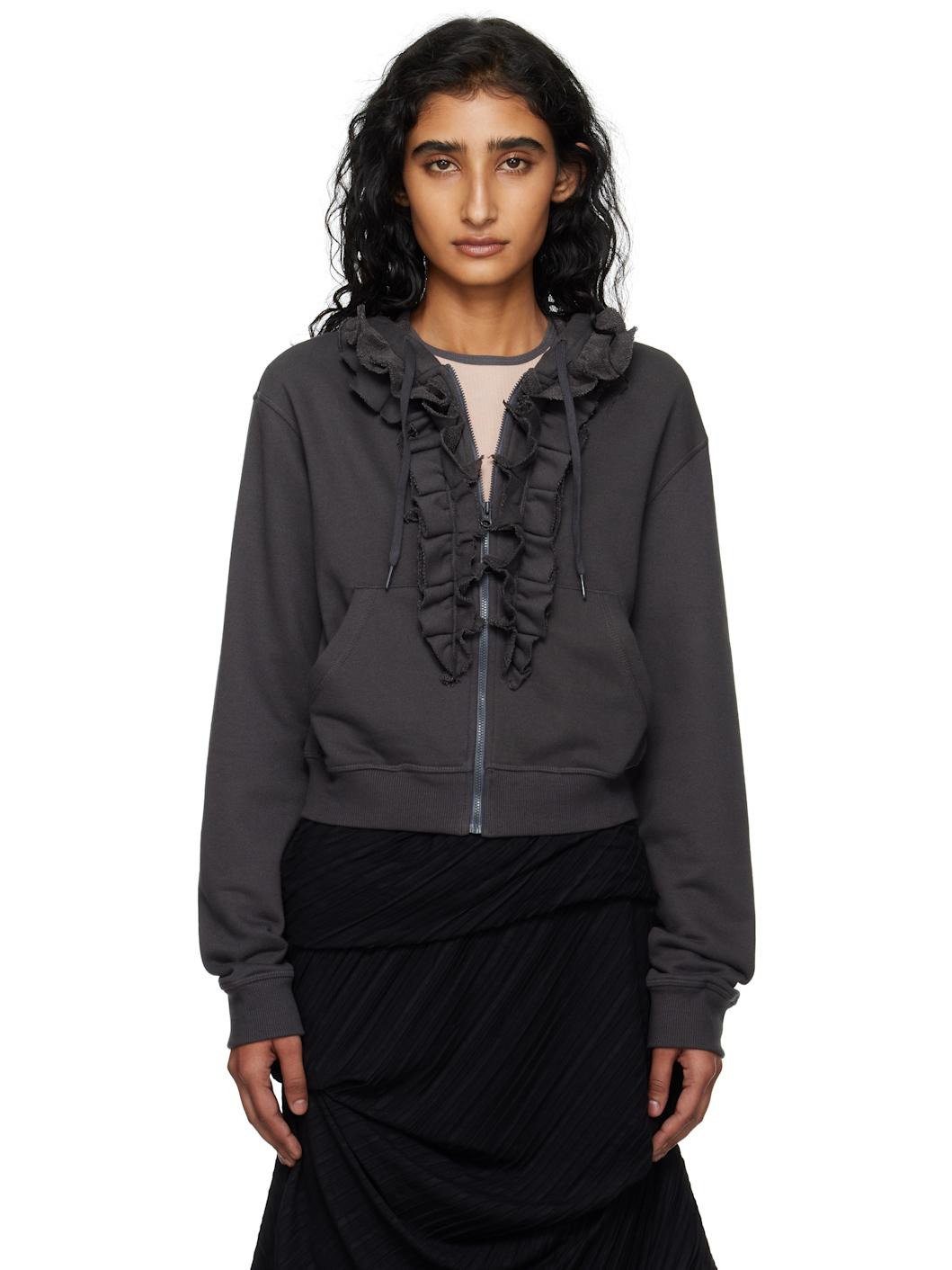 French terry hoodie. · Drawstring at hood · Zip closure · Ruffled trim and patch pockets at front · Rib-knit hem and cuffs Supplier color: Charcoal Body: 57% cotton, 43% polyester. Trim: 94% cotton, 6% polyurethane. Made in South Korea 252731F097005