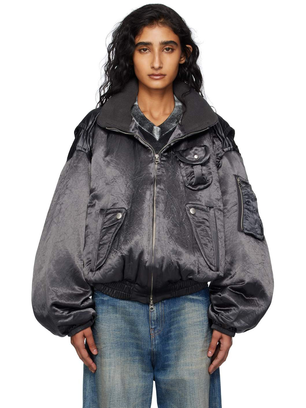 Insulated satin bomber jacket. · Stand collar · Two-way zip closure · Patch pocket at chest · Flap pockets at waist · Elasticized hem and cuffs · Dropped shoulders · Utility pocket and pen slots at sleeve · Rib-knit interior collar · Welt pocket at interior · Twill lining · Logo-engraved silver-tone hardware Supplier color: Charcoal Body 1: 100% acetate. Body 2: 70% acrylic, 23% polyester, 7% polyurethane. Fill: 100% polyester. Lining: 100% polyester. Made in South Korea 252731F058000