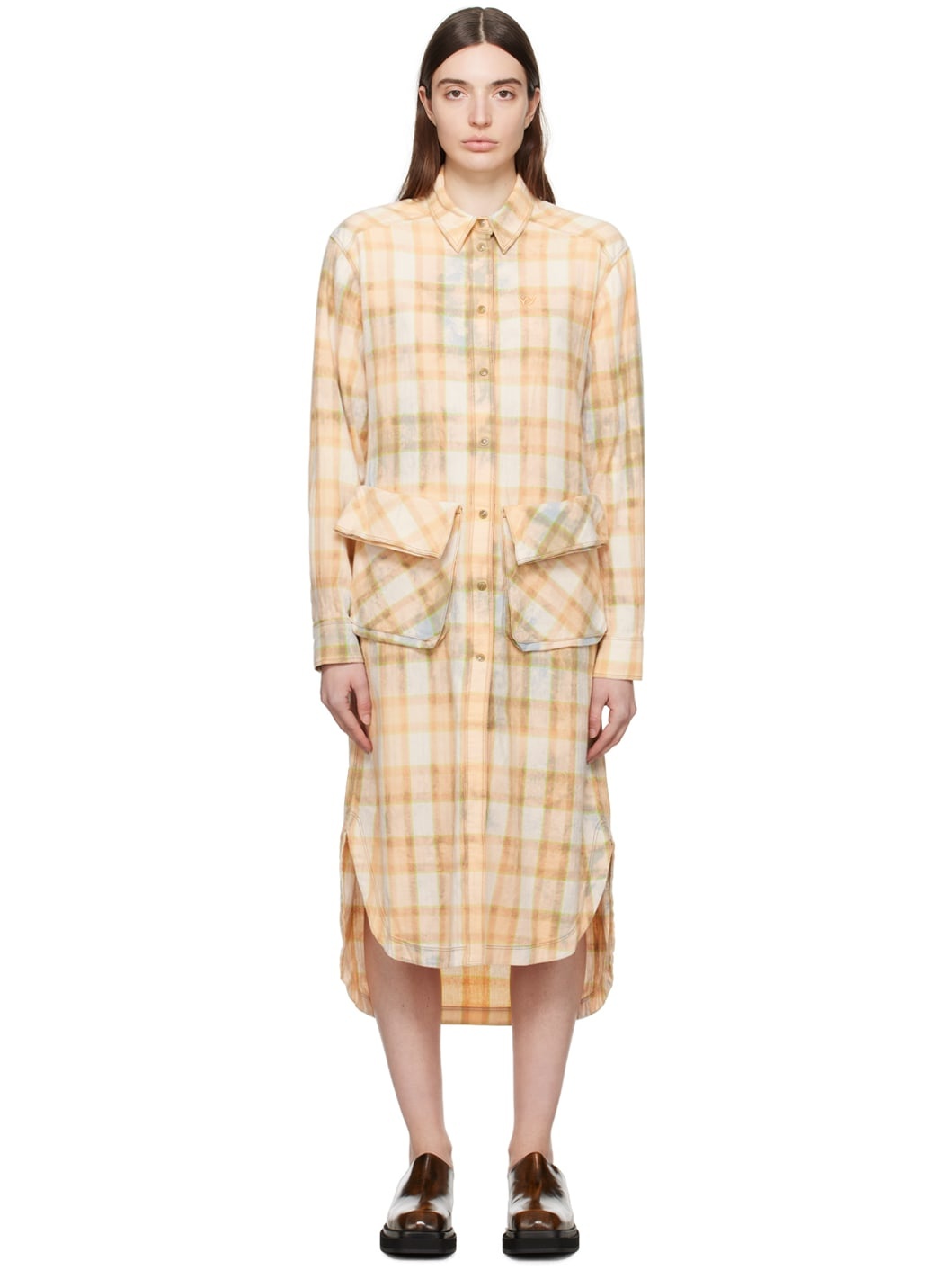 Cotton flannel dress. Check pattern, fading, and paint splatter effect throughout. · Spread collar · Press-stud closure · Modified flap pockets · Shirttail hem · Single-button barrel cuffs · Press-stud tab at back yoke Supplier color: Salmon 100% cotton. Made in South Korea 241731F109000