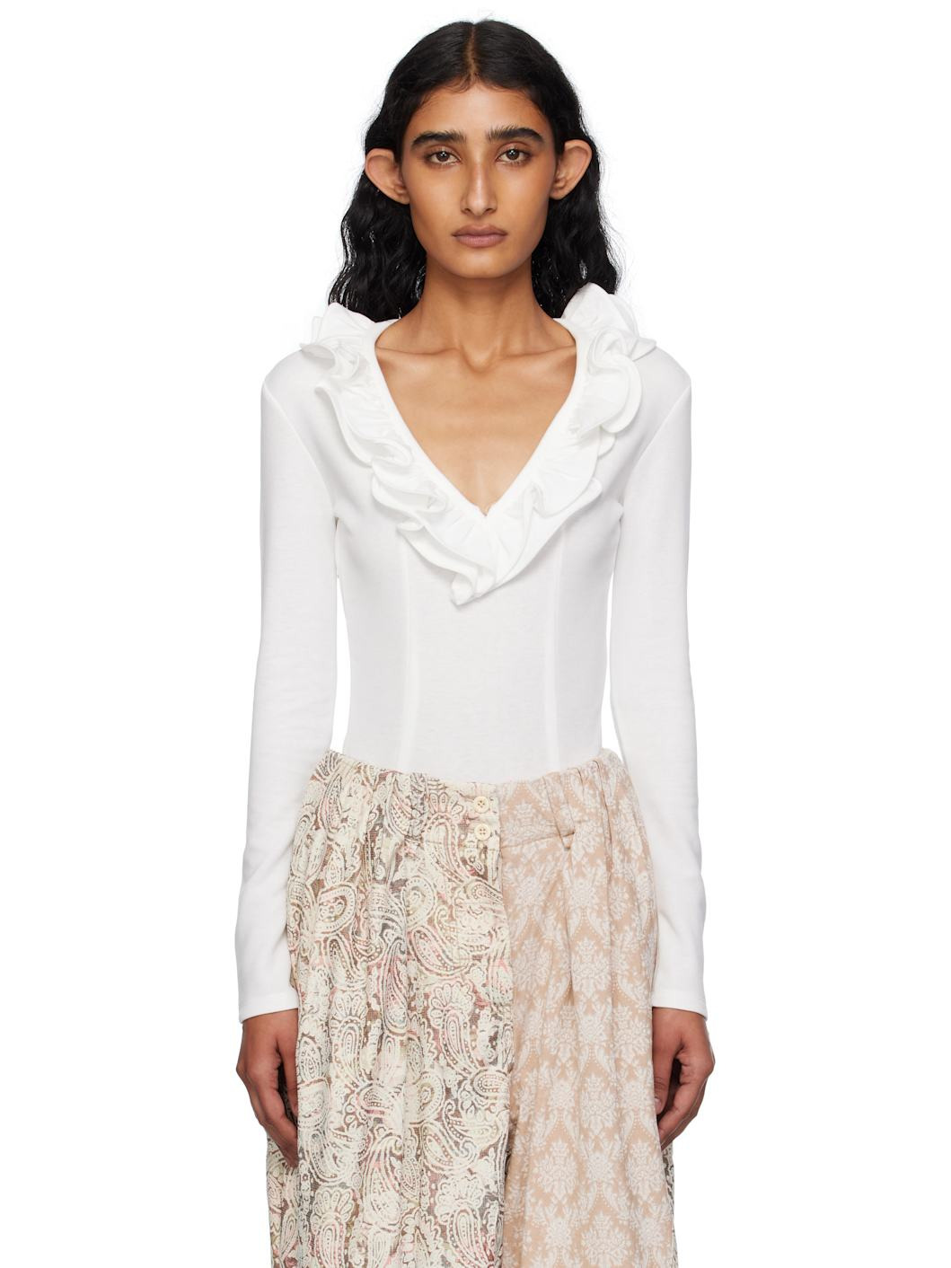 Stretch cotton-blend jersey bodysuit. · Ruffled trim at plunging V-neck · Darts at front · Press-stud fastening at bottom Supplier color: White 62% cotton, 33% polyester, 5% polyurethane. Made in South Korea 252731F358001