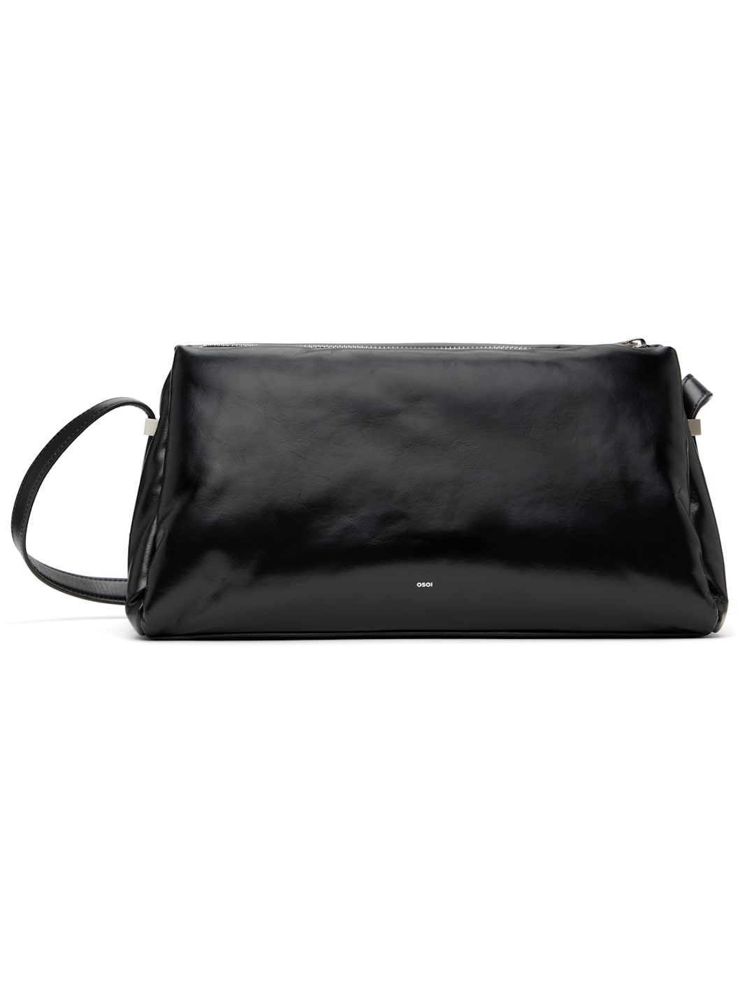 Buffed leather shoulder bag in black. · Adjustable shoulder strap · Patch pocket at face and back face · Logo embossed at back face · Zip closure · Microfiber lining · Logo-engraved silver-tone hardware · H7" x W12" x D3.5" Supplier color: Black Body: 100% leather. Lining: 85% polyester, 15% polyurethane. Made in South Korea 251811F048018