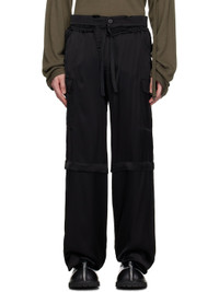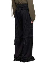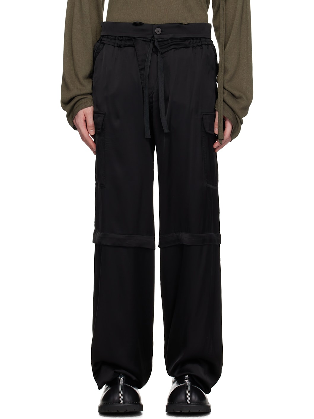 Wide-leg stretch viscose-blend satin cargo pants. Raw edges throughout. · Drawstring at waistband and cuffs · Four-pocket styling · Zip fly · Pleat and drawstring at knees · Cargo pocket at outseams · Rubberized logo patch at back waistband · Logo flag at back Supplier color: Black 53% viscose, 44% rayon, 3% elastane. Made in Greece 251016M188003